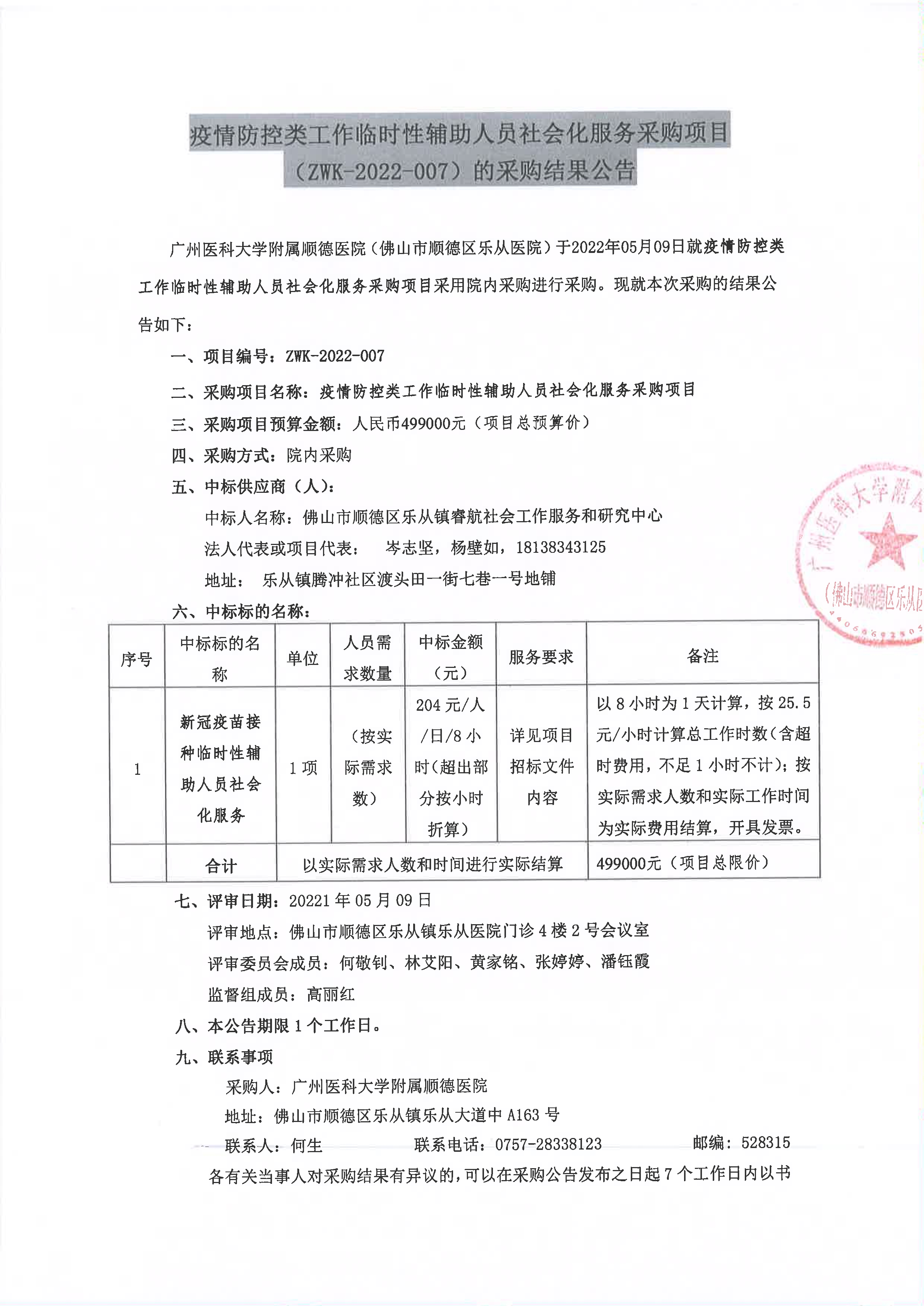 上一篇: 新冠疫苗接种临时性辅助人员社会化服务采购项目(ZWK-2022-011)的采购结果公告