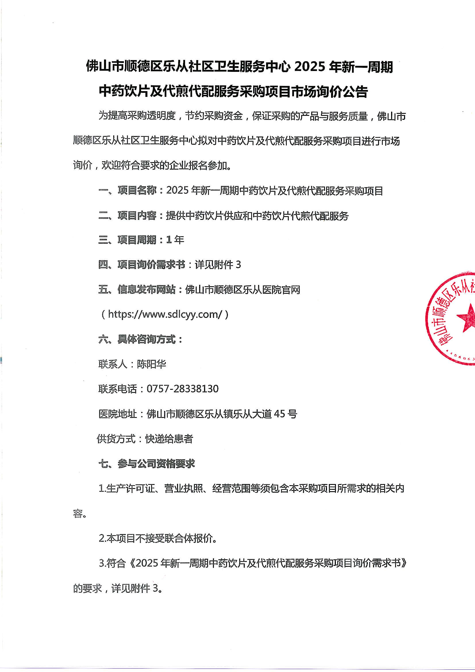 佛山市顺德区乐从社区卫生服务中心2025年新一周期中药饮片及代煎代配服务采购项目市场询价公告